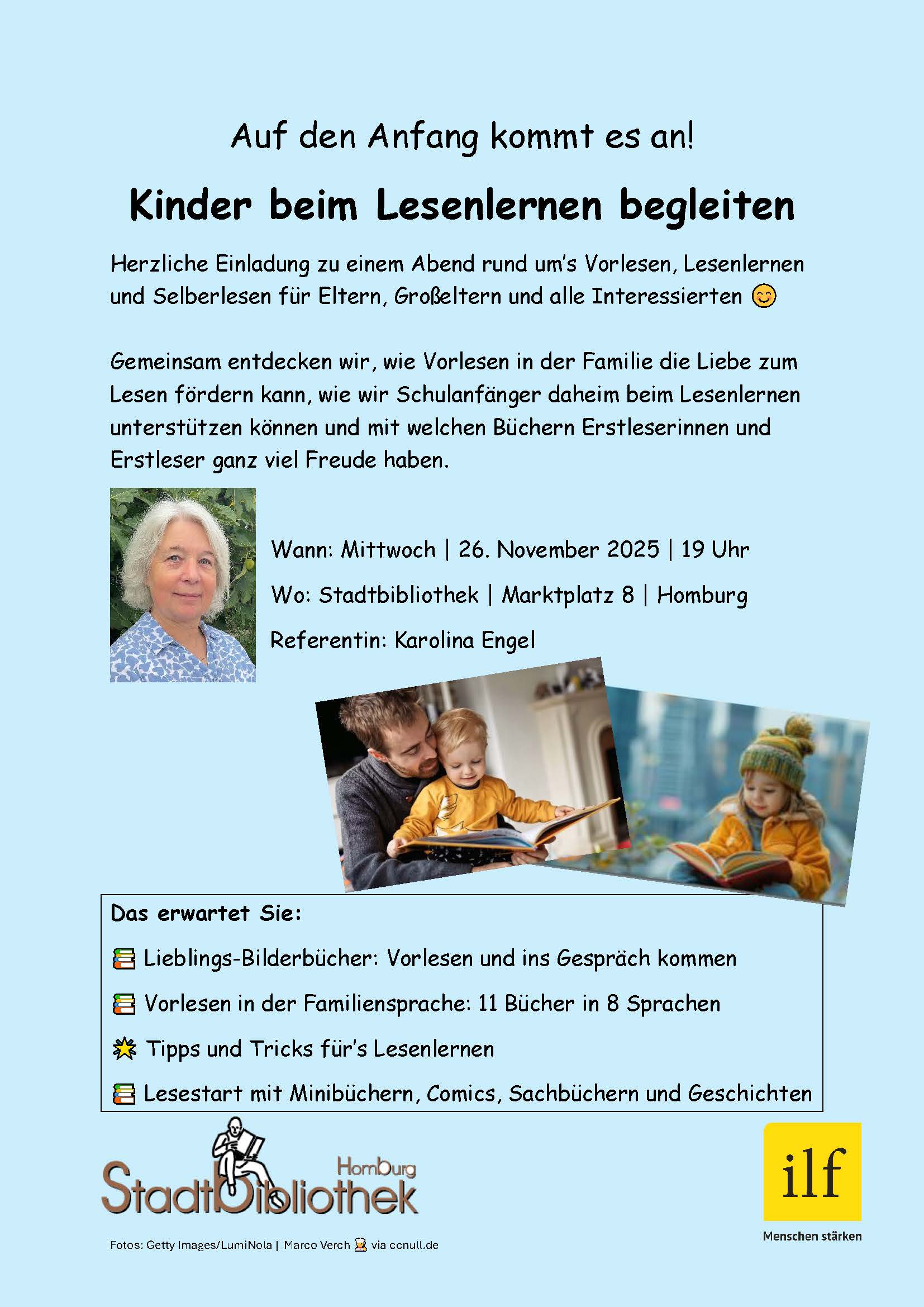 Im Rahmen der Buchspende des Lions Club Homburg an die Stadtbibliothek Homburg bietet Frau Karolina Engel vom ILF Saarbrücken am Mittwoch, 26.11.2025 ab 19.00 Uhr einen Leseabend mit dem Titel „Auf den Anfang kommt es an! – Kinder beim Lesenlernen begleiten“ an. Die Veranstaltung findet in der Stadtbibliothek, Marktplatz 8 in Homburg statt.