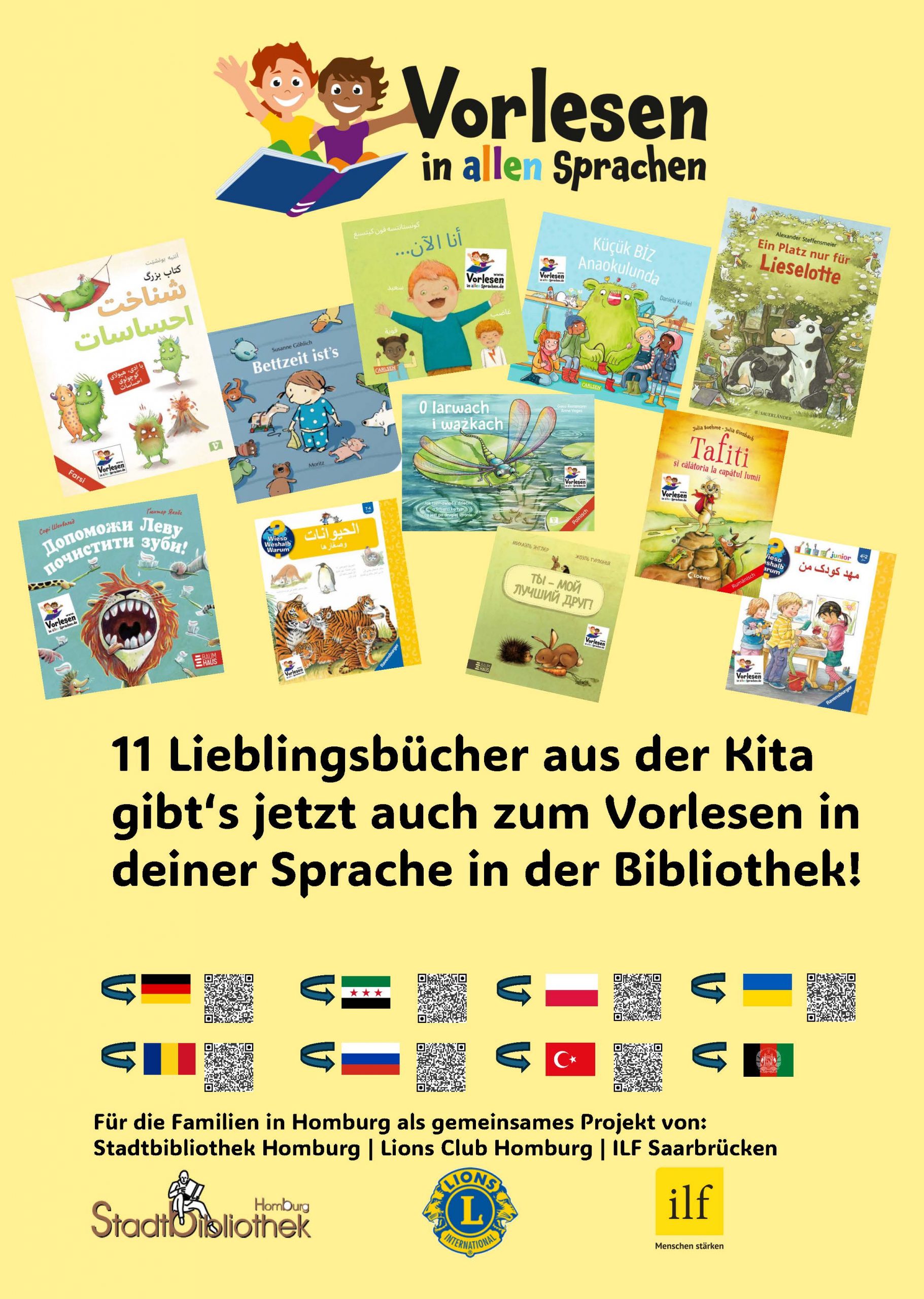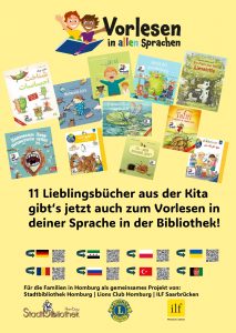 Kinder in Homburg können sich über neuen Lesestoff in ihrer Familiensprache freuen: Dank einer großzügigen Spende des Lions Club Homburg stehen ab sofort 88 neue Bücher in der Stadtbibliothek Homburg zur Ausleihe bereit. Dabei handelt es sich um elf beliebte Vorlesetitel für Kinder von etwa zwei bis sieben Jahren, die nun neben Deutsch zusätzlich in sieben weiteren Sprachen verfügbar sind: Arabisch, Farsi, Polnisch, Rumänisch, Russisch, Türkisch und Ukrainisch.